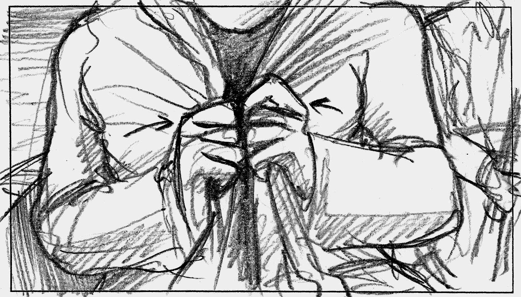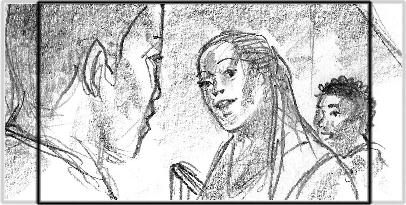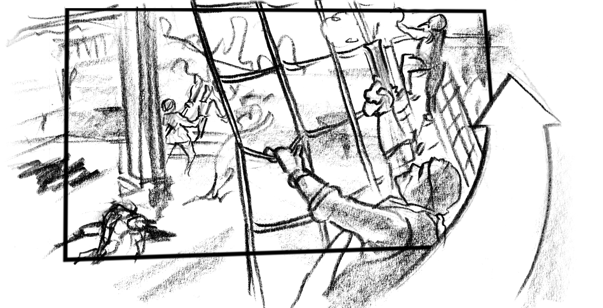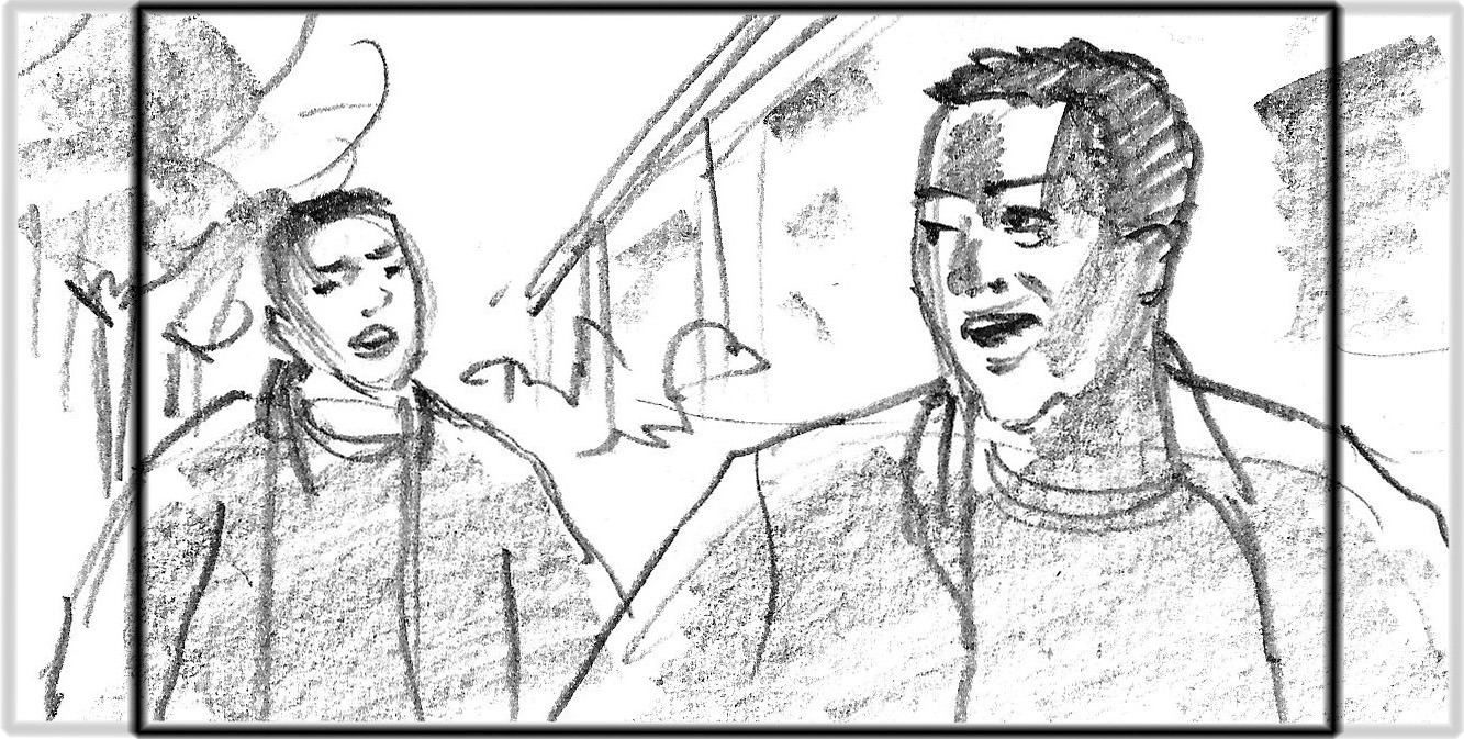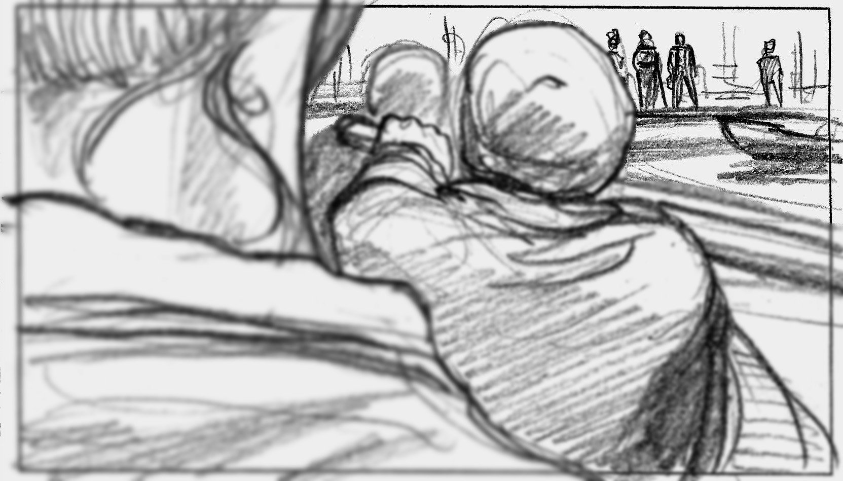 Pencil on paper is a very quick way to get storyboards drawn. This style works well when working out a narrative sequence in a face to face storyboarding session with a director.