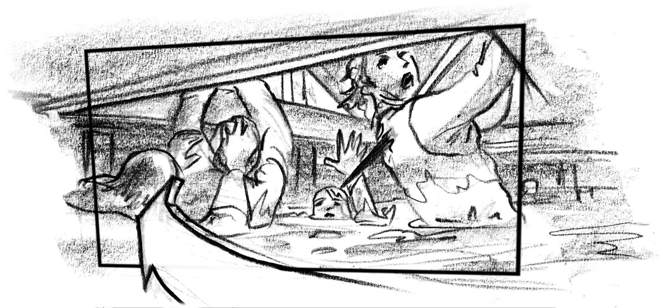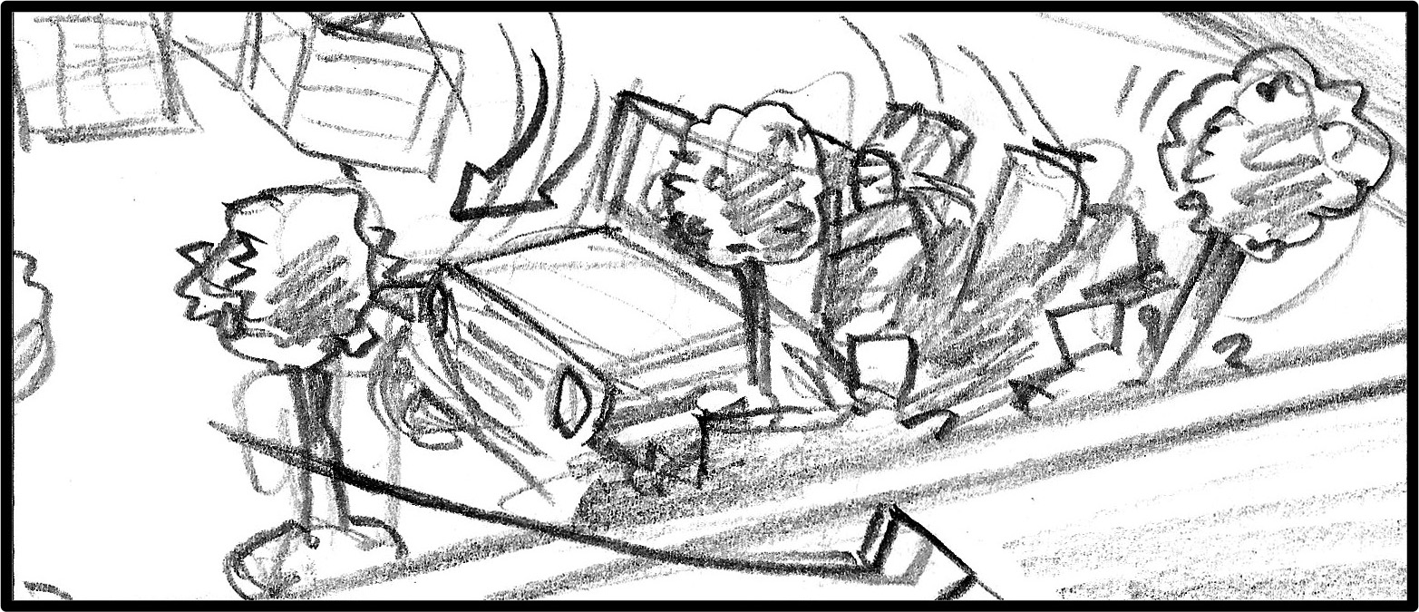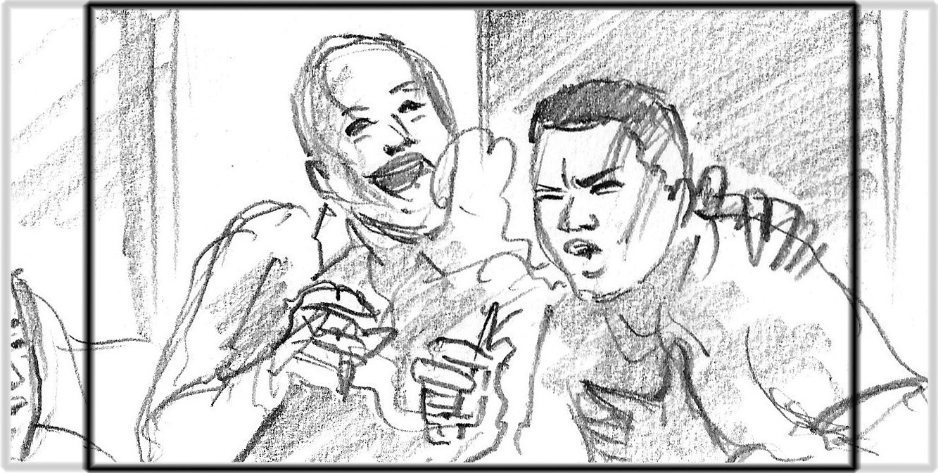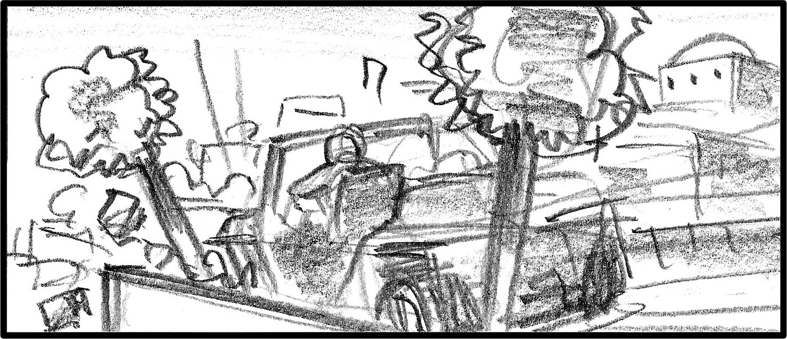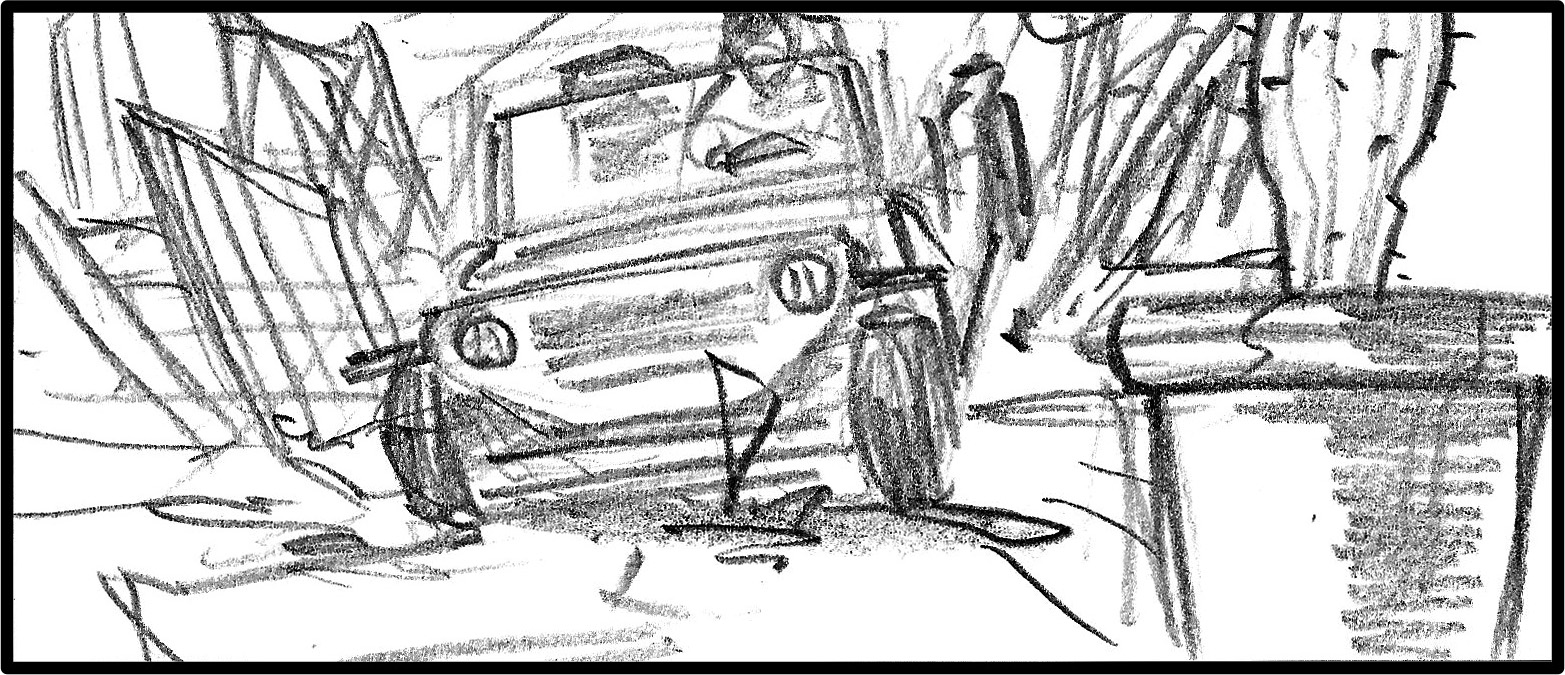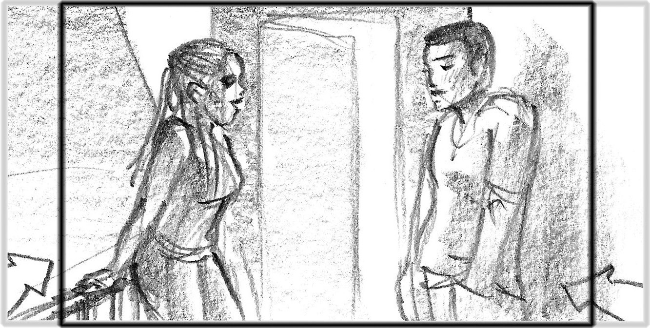 Pencil on paper is a very quick way to get storyboards drawn. This style works well when working out a narrative sequence in a face to face storyboarding session with a director.