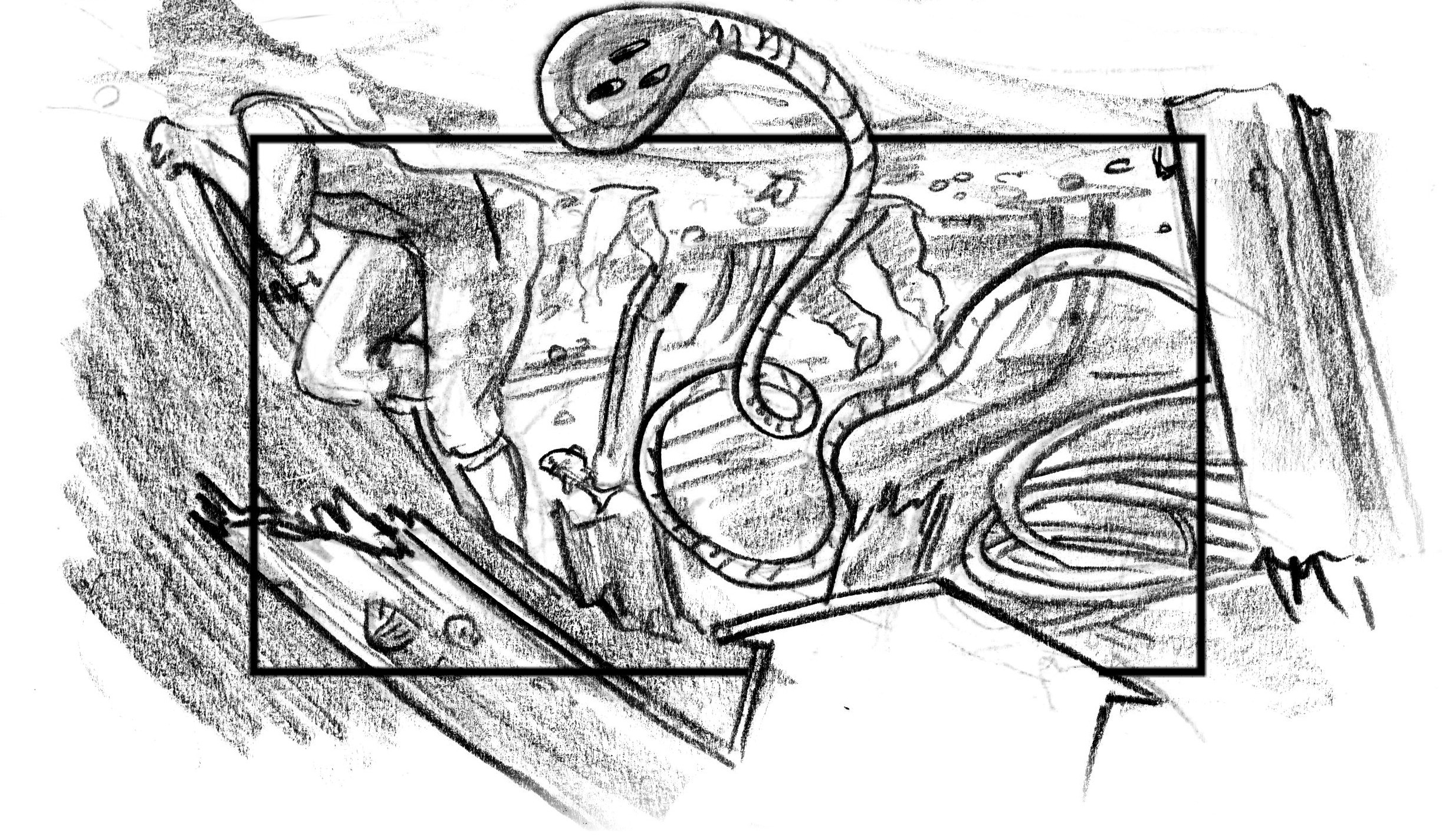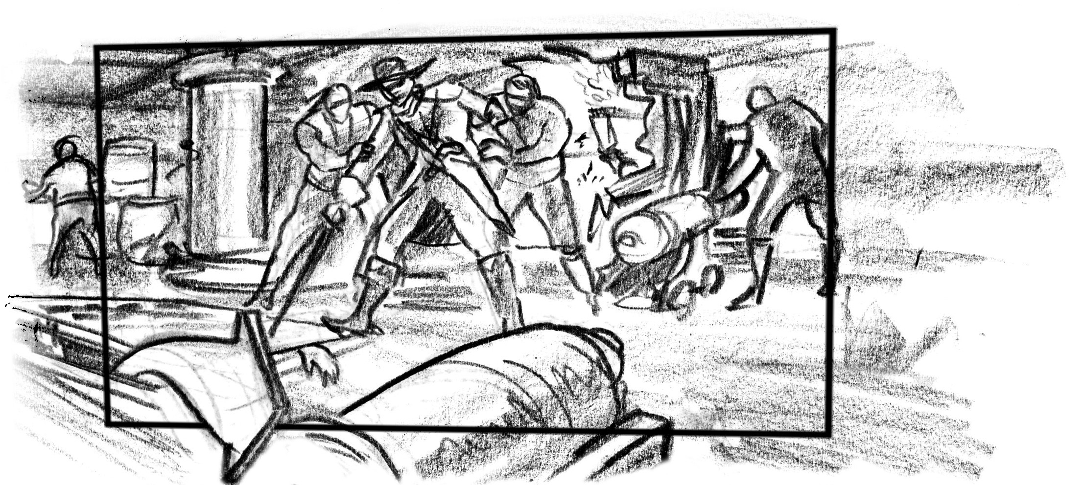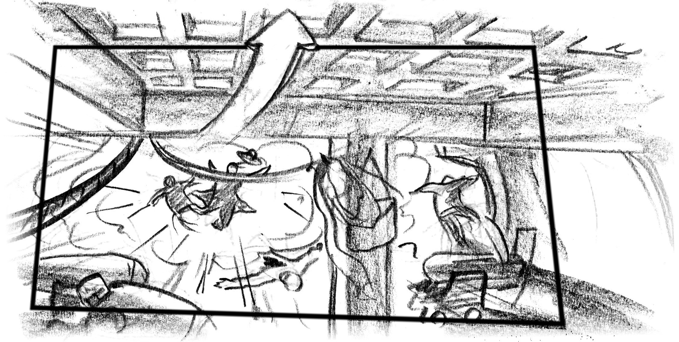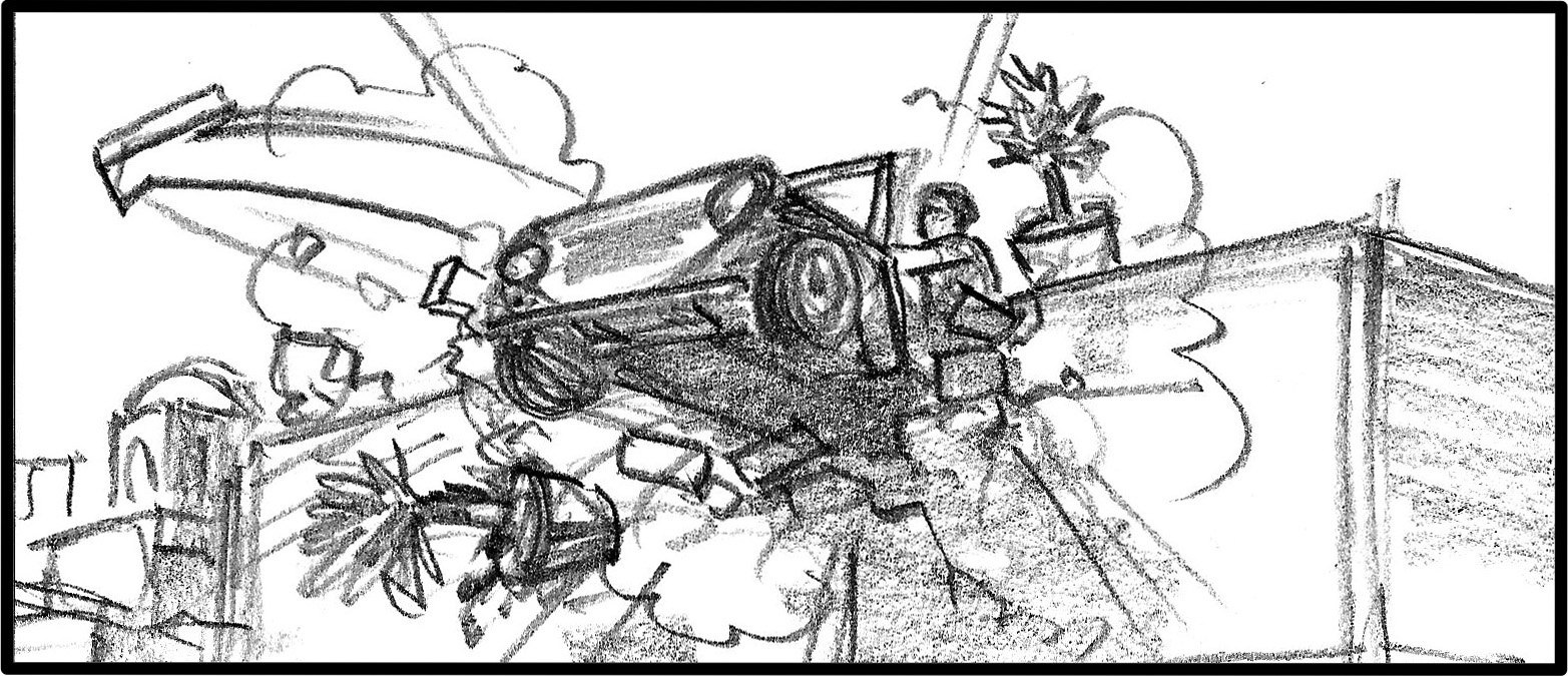 Pencil on paper is a very quick way to get storyboards drawn. This style works well when working out a narrative sequence in a face to face storyboarding session with a director.