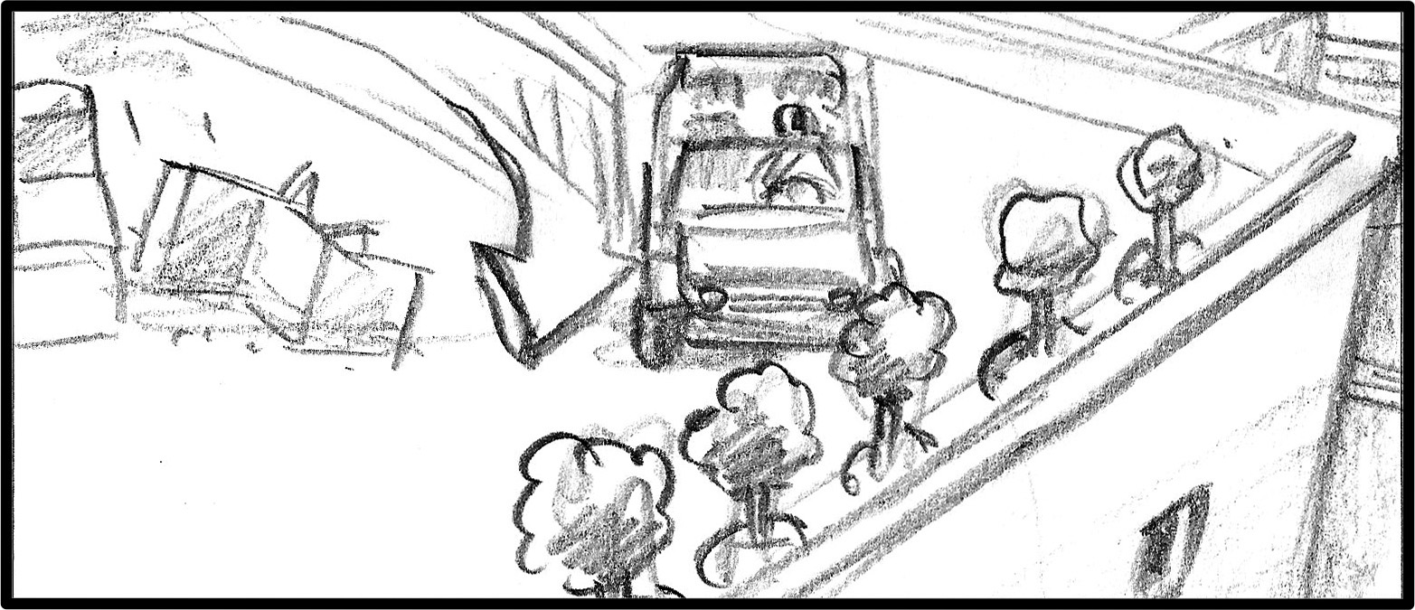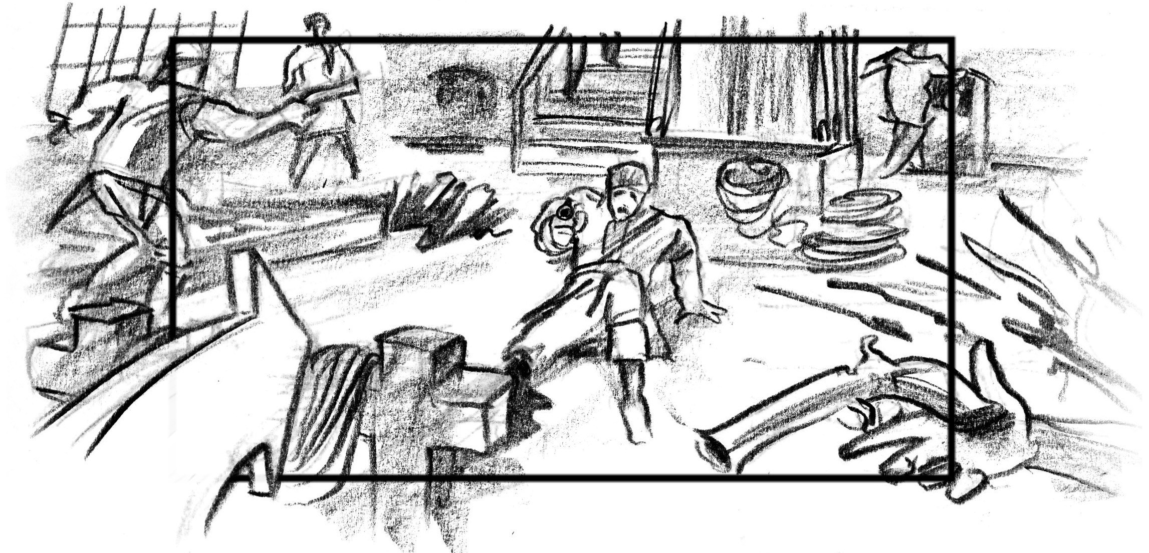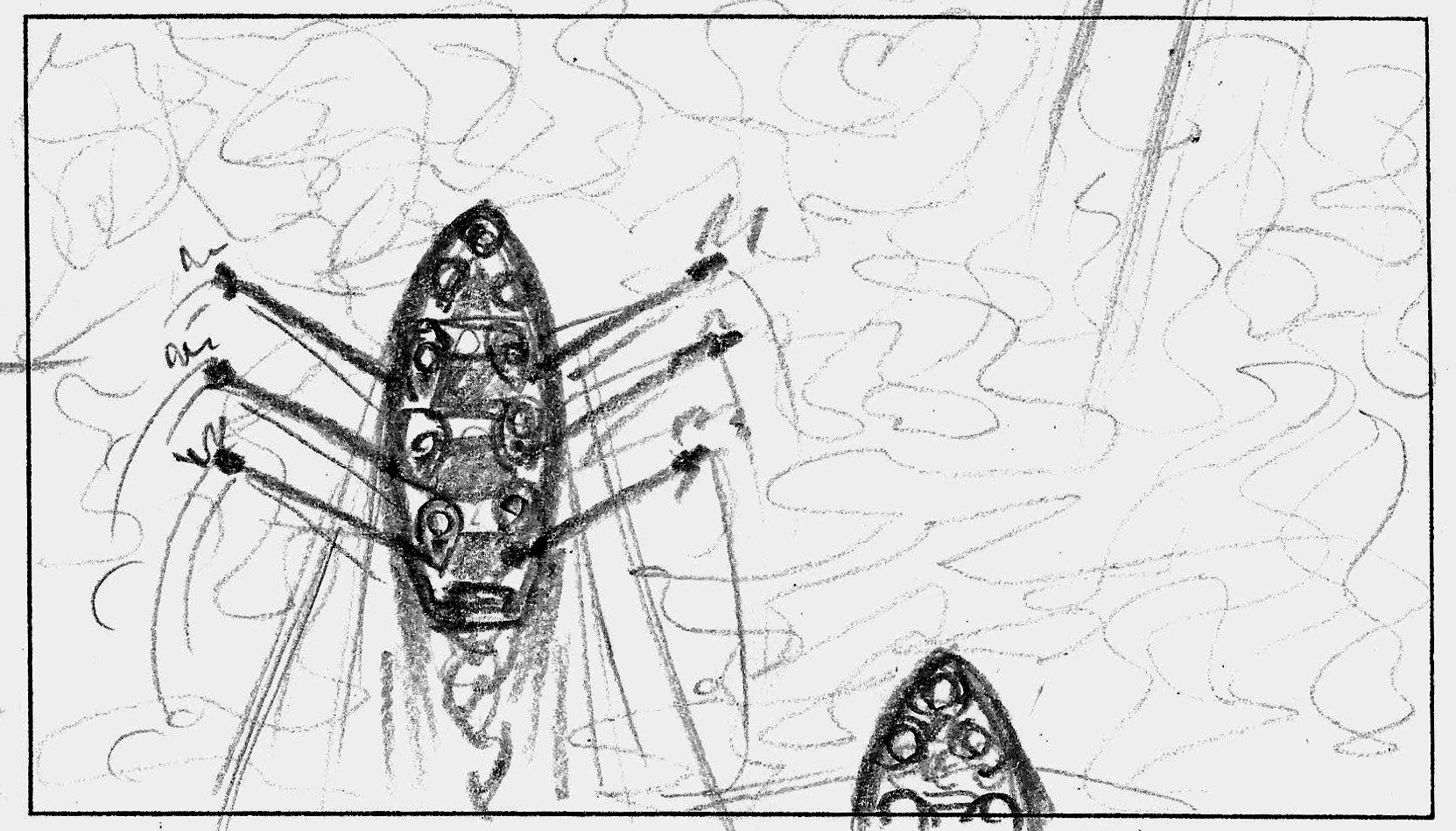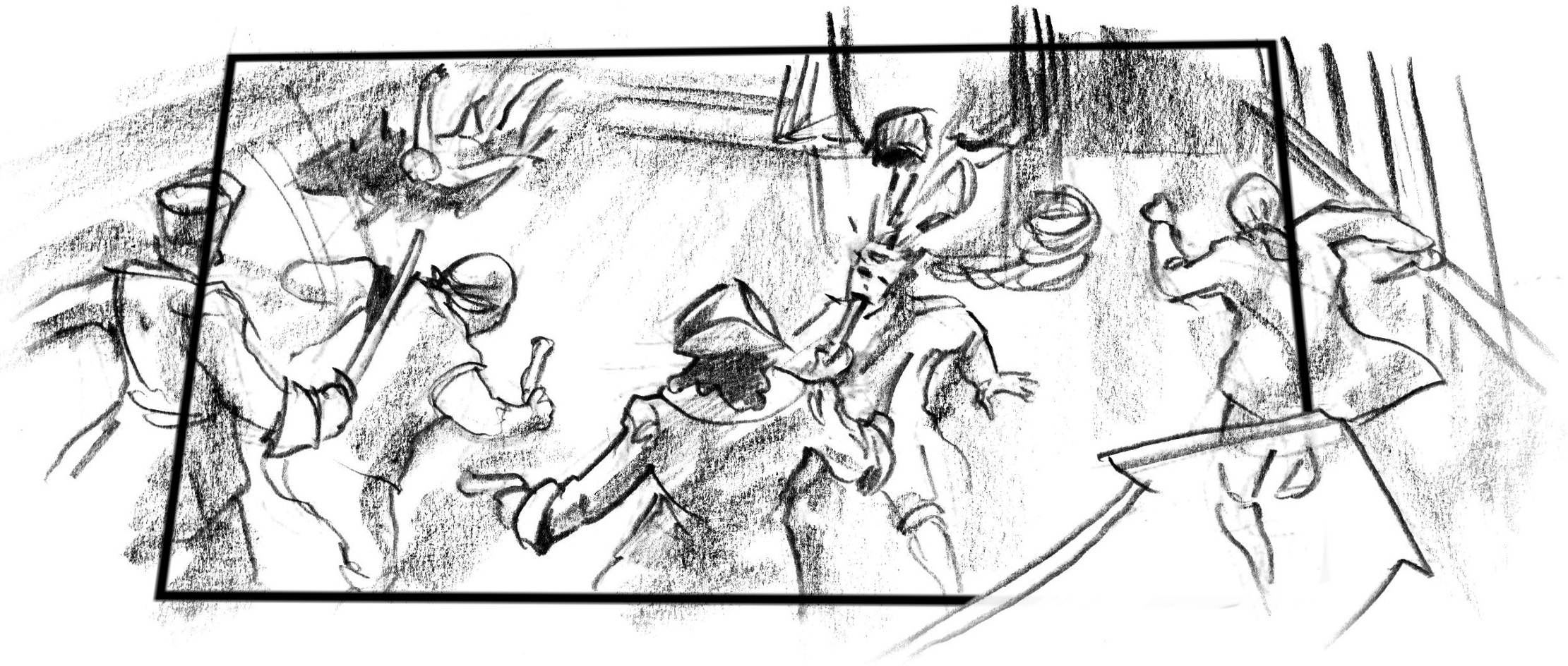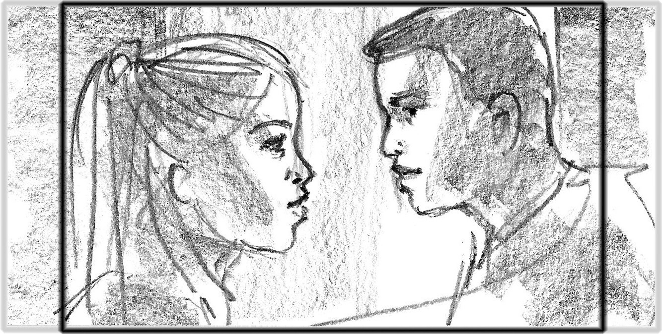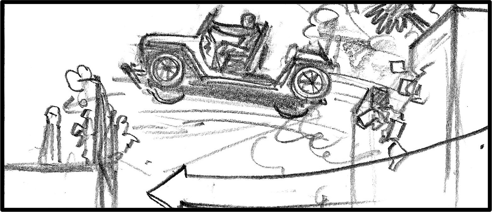 Pencil on paper is a very quick way to get storyboards drawn. This style works well when working out a narrative sequence in a face to face storyboarding session with a director.