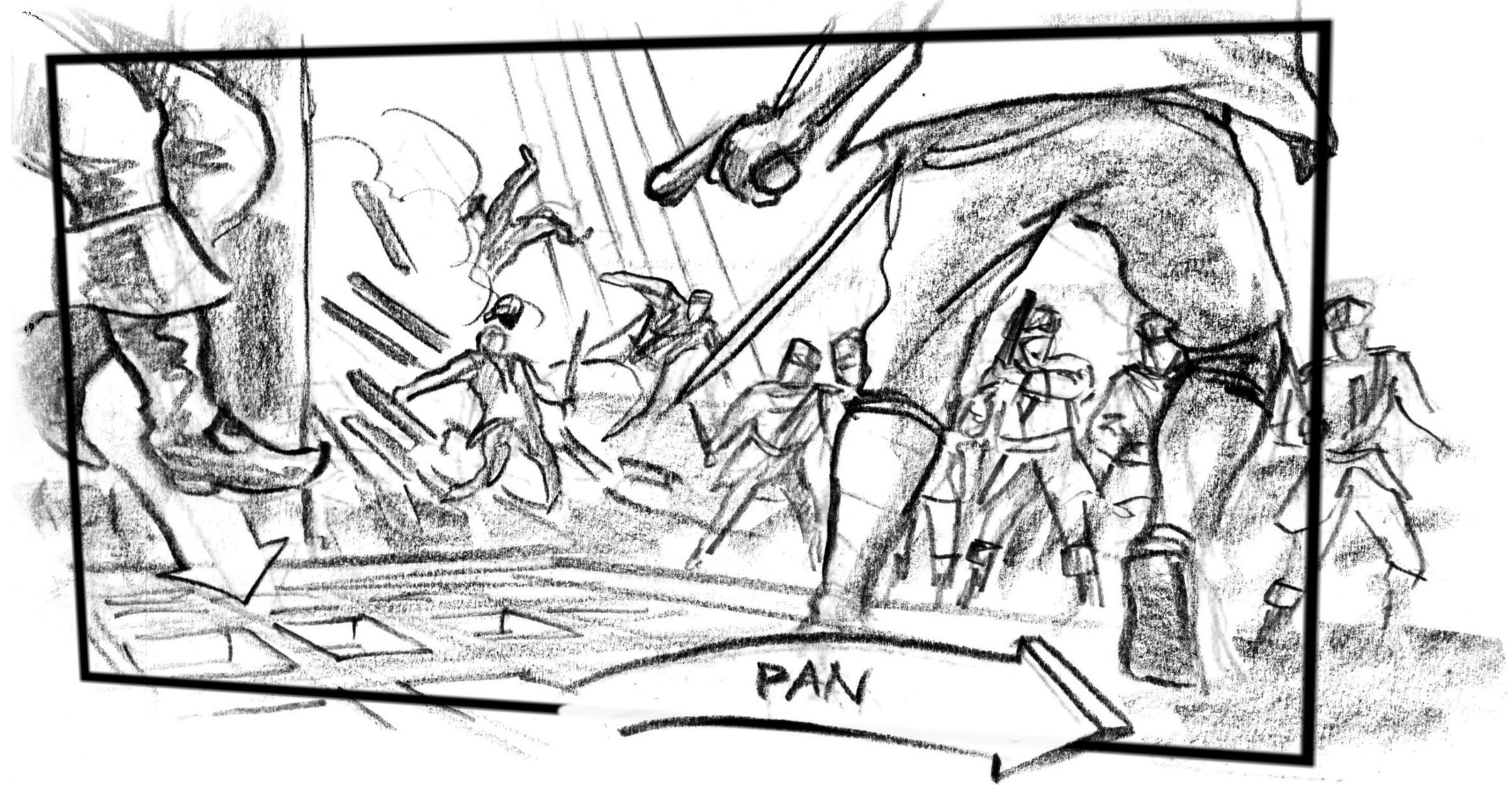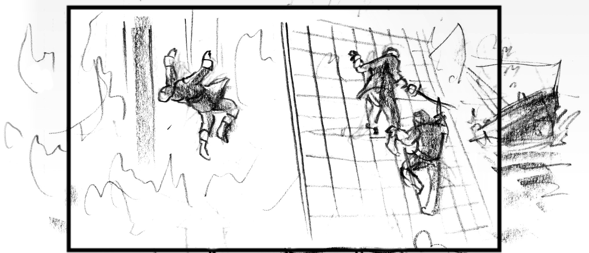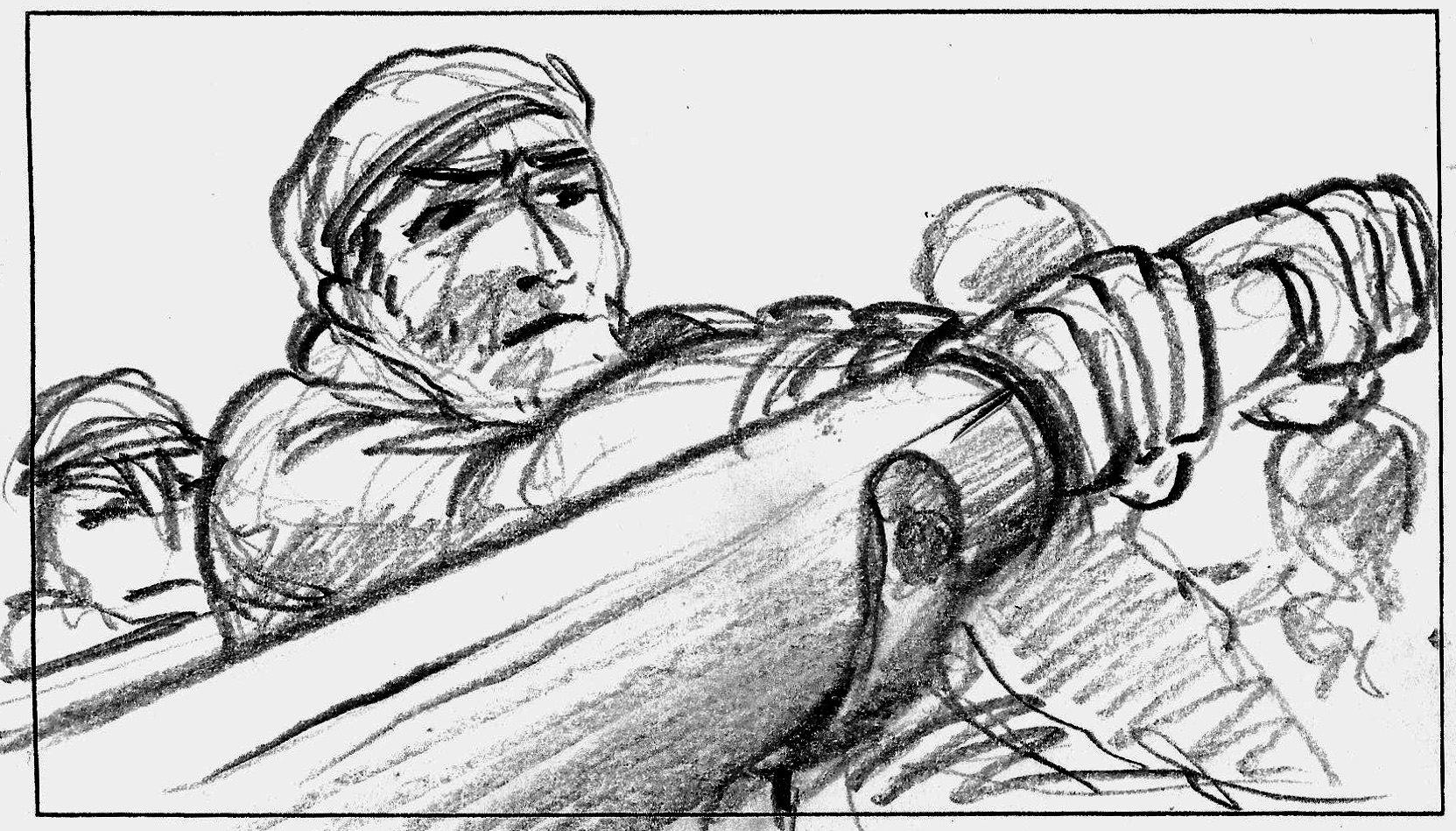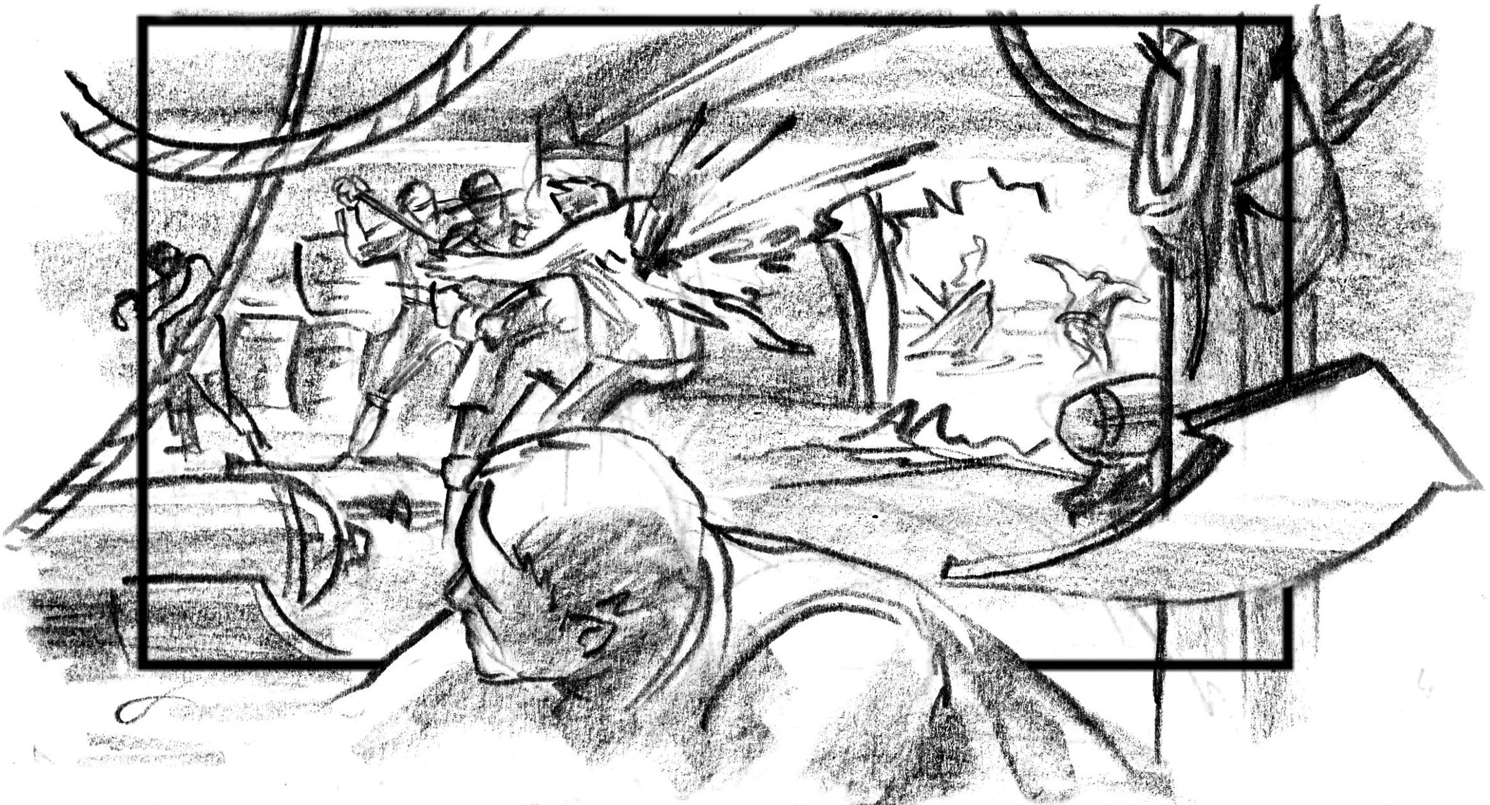 Pencil on paper is a very quick way to get storyboards drawn. This style works well when working out a narrative sequence in a face to face storyboarding session with a director.